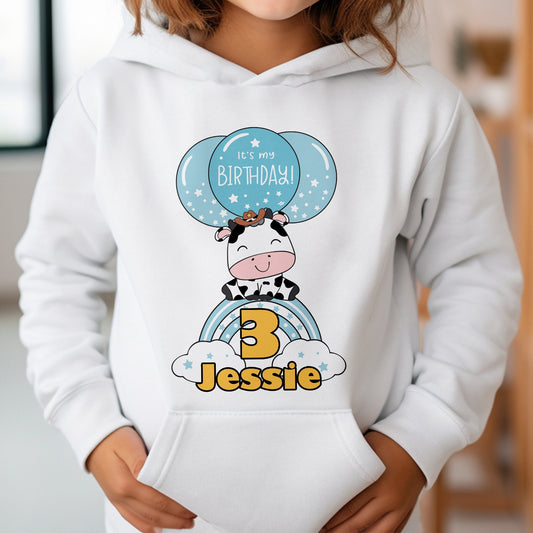 Personalised Cow Clouds Birthday T-Shirt, Any Name Any Age, Colourful Farmyard Animals Shirt, Custom Cow Birthday Hoodie, Gifts for Children
