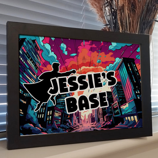 Personalised Name Wall Art Print, Colourful Kids Room Decor, Boys Girls Childrens Super Hero Bedroom Framed Print, Fun Superhero Print