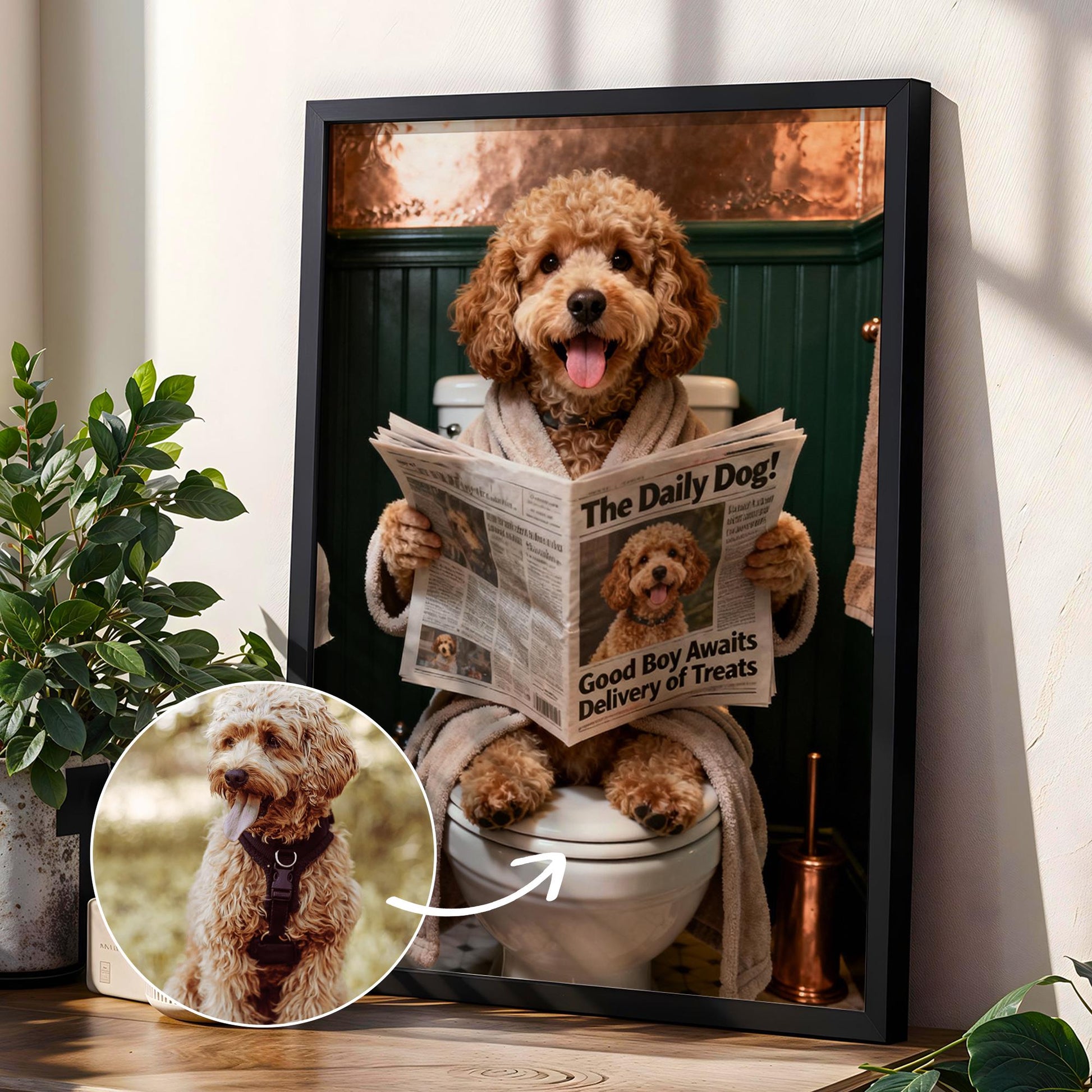 Custom Pet on Toilet with Newspaper | Unique Pet Gift, Fun Bathroom Print, Dog on Toilet, Personalised Pet Wall Art, Pet Portrait from Photo