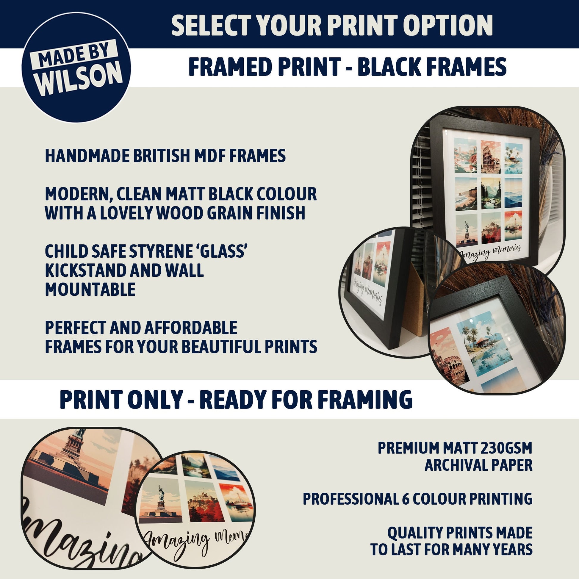 Add a lovely british made wooden frame to your print by selecting the "Framed - Black" or "Framed - White" option on the size you like. Frames are shown in the listing images and are made of mdf with a nice smart matt black or white finish. They come with child safe plexiglass and a thin bezel for that nice modern look. A perfect ready to gift option for sending directly to a loved one.