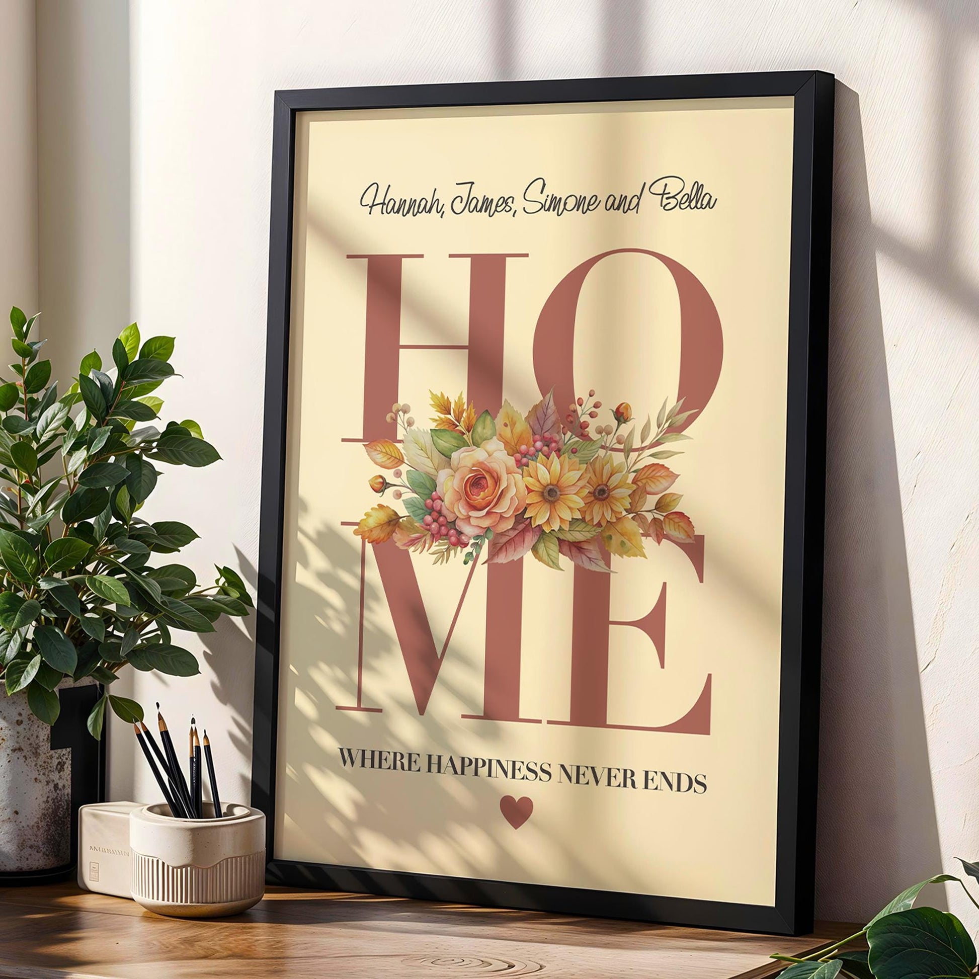 Personalised Home Floral Bouquet Print for Families | Housewarming Gift, Custom Family Home Print, Flower Home Decor Print for Her Mum