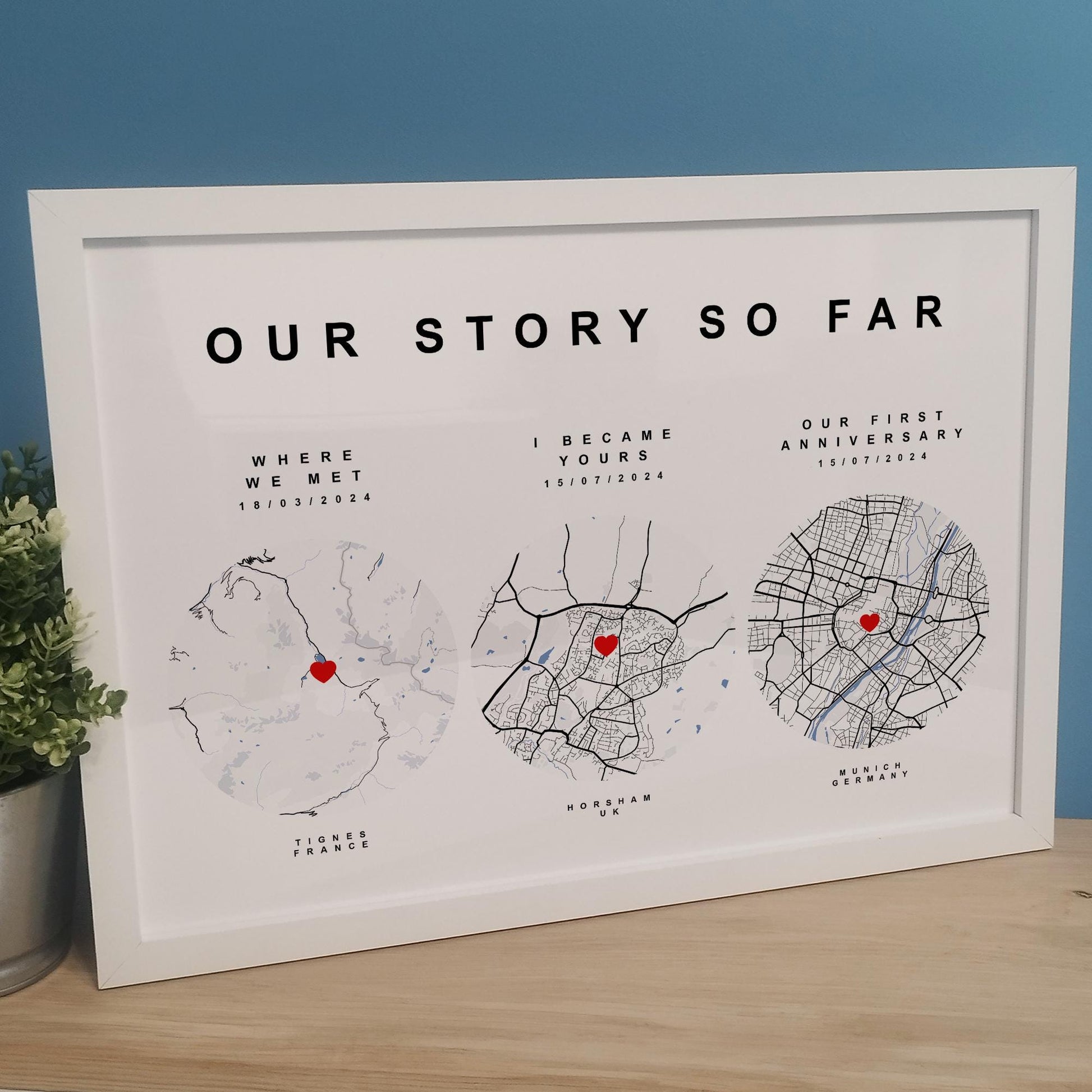Celebrate the journey of love you've embarked on together with a Personalised Anniversary Map Print. This custom love story print is a heartfelt and sentimental gift, creating a lasting memory or your cherished memorable locations.